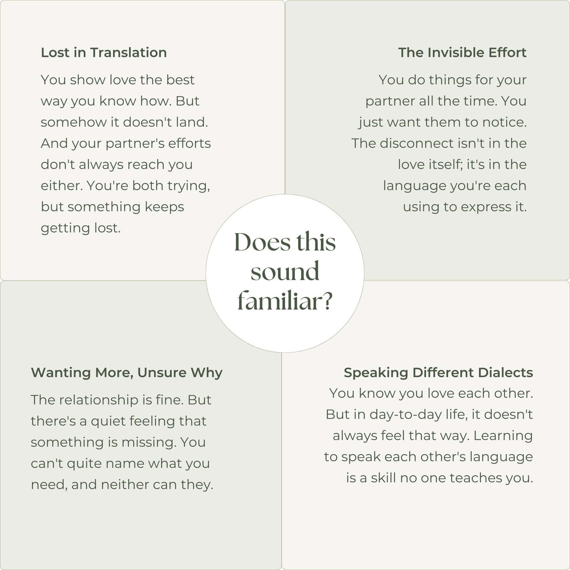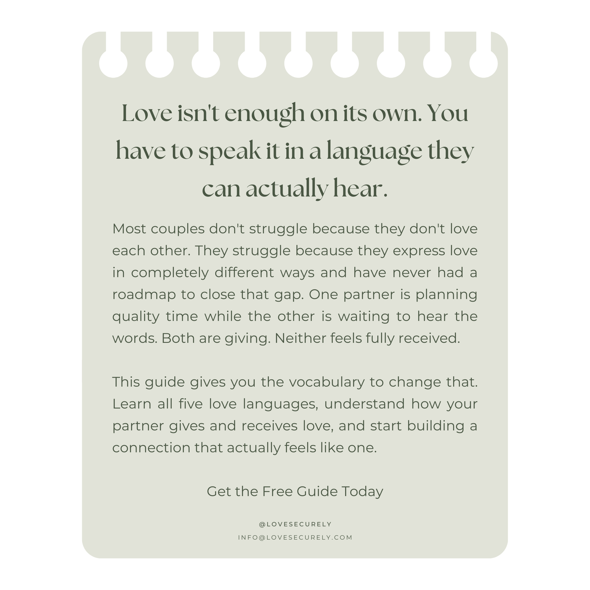 Every day you spend not understanding your partner's love language is another day of good intentions that don't translate into felt love. You both deserve to feel truly appreciated and understood. When you speak your partner's love language fluently, love stops feeling like work and starts feeling natural.